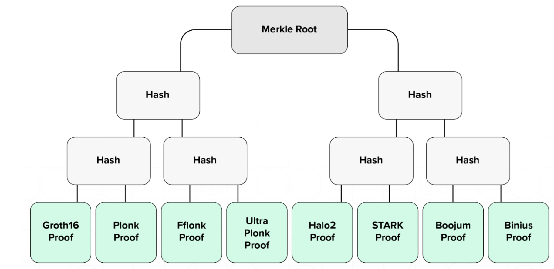 Figure: zkVerify Merkle tree, which shows various proof types at its leaves, serving as a form of natural aggregation across heterogeneous proving systems.